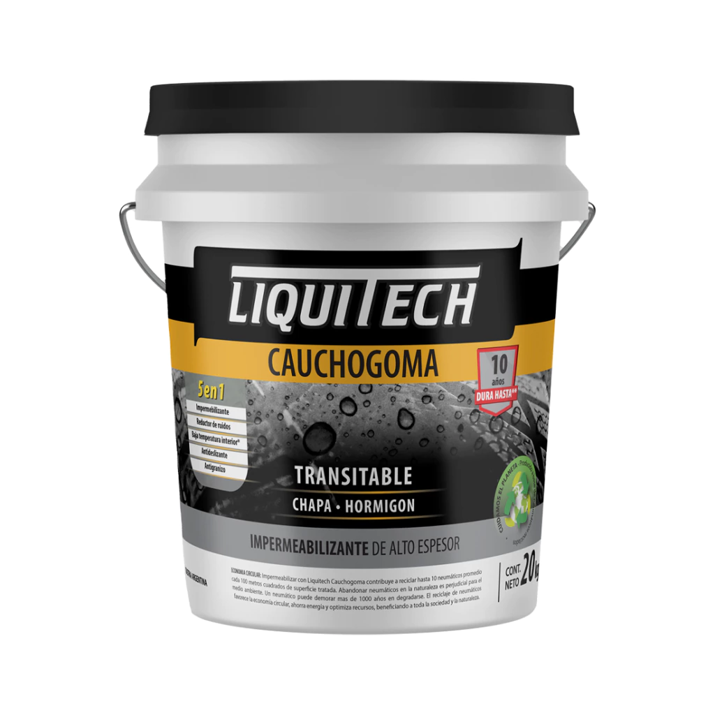 Liquitech Cauchogoma es un impermeabilizante de alto espesor compuesto por polímeros de caucho microtriturado reciclado de neumáticos, combinado con resinas acrílicas y poliuretano. Es eco-amigable, resistente a la abrasión, los rayos UV, y el desgaste mecánico. Es un producto antigranizo, antideslizante y 100% impermeable, que adhiere a diversas superficies como vidrio, plásticos, membranas asfálticas, hormigón, chapas, madera, y brea. Además, permite la colocación directa de cerámicos sin necesidad de una carpeta adicional.